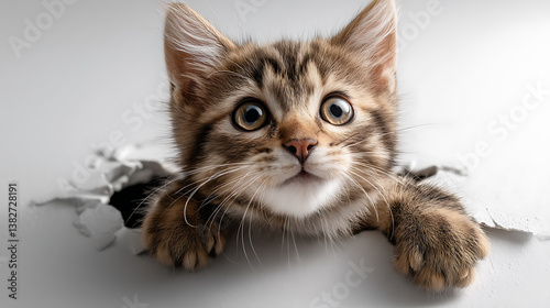 Cute cat peeking through torn paper on white wall cinematic lighting realistic fur soft shadows high detail