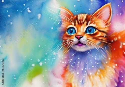 Cute cat watercolor in falling snow