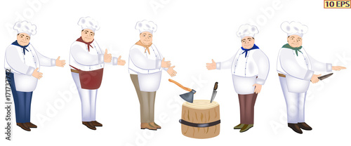 Cute chef smiling. Happy chef in uniform. Pretty chef. Vector illustration to design food, menu, restaurant or cafe.