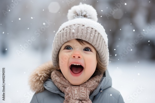Cute child with happy face wearing a warm hat and warm jacket surrounded with snowflakes. Winter holidays concept.