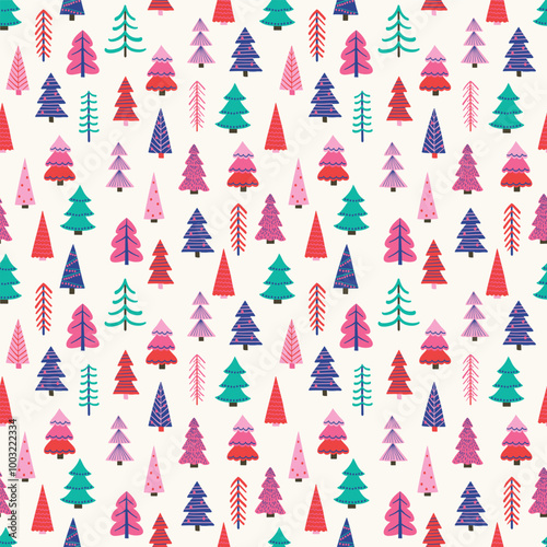 Cute Christmas pattern with colourful trees. Wallpaper concept. Vector illustration