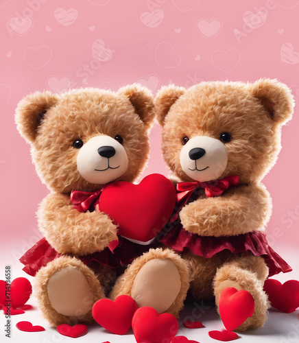 Cute Couple Of Teddy Bears Holding Heart Isolated On Pink Background. Generative AI