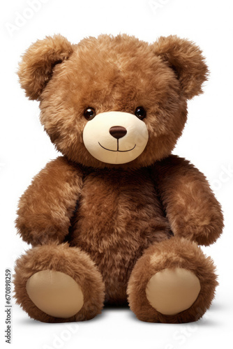 Cute dark brown fluffy teddy bear doll with a happy face and big shiny eyes on a white background