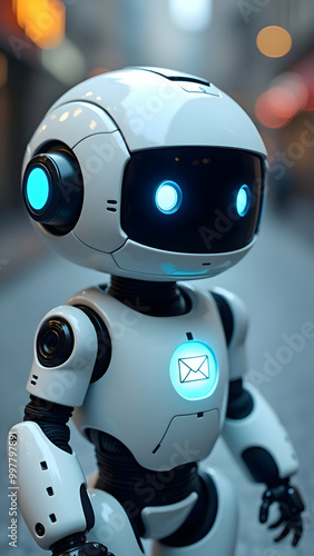 Cute delivery robot with glowing blue lights holding a package in a futuristic city street, AI technology concept.