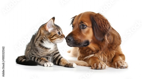 Cute dog and cat lying together on white background. Adorable friends cuddle, furry companions rest. Brown and grey fur, whiskers, and playful expressions.