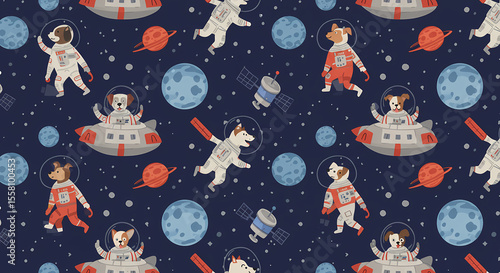 Cute dogs in space suits, exploring planets and spaceships, a playful repeating pattern.