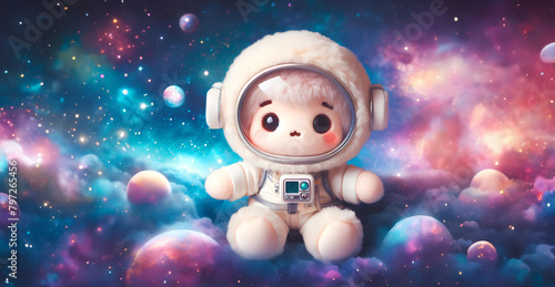 Cute doll wearing a space suit, Galaxy background, stars, planets