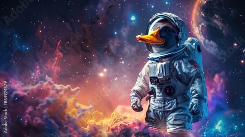 Cute duck in space wearing spacesuit. Exploration concept, space glaxy background, full body