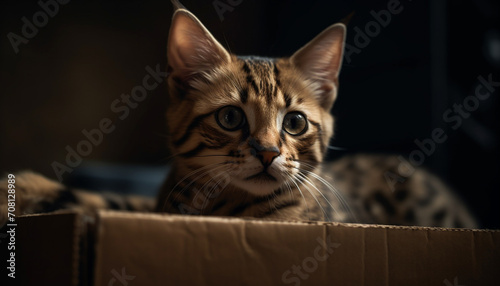 Cute feline kitten with striped fur, looking at camera indoors generated by AI