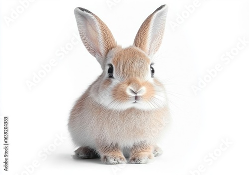Cute fluffy brown and white baby rabbit sitting and looking forward on a white background