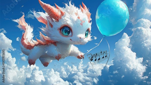 Cute Fluffy Dragon Flying with Balloon and Music Notes
