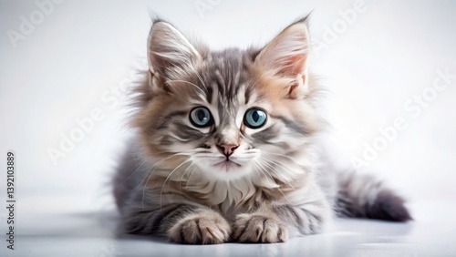Cute Fluffy Gray Kitten Portrait, White Background, Adorable Grey Cat, Pet Photography