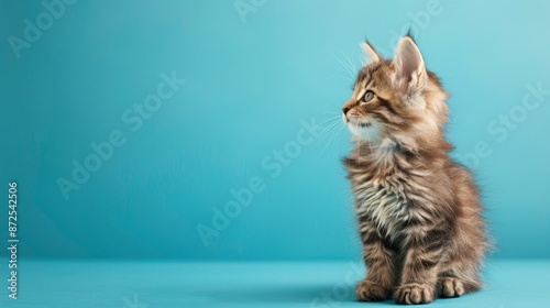 Cute Fluffy Kitten Sitting On A Blue Background, Shown From The Side. Empty Space For Text Or Design