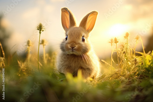 Cute fluffy little rabbit on a meadow grass field in the morning, happy bunny running in green garden with sunlight background, symbol of Easter festival day.