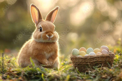Cute fluffy rabbit beside a basket of colorful eggs in a sunny garden during springtime