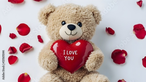 Cute Fluffy Teddy Bear Holding "I LOVE YOU" Heart, Sitting with Rose Petals on White Background
