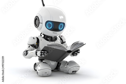 Cute friendly artificial intelligence robot reading book 3d illustration isolated on white. Chatbot and AI assistant concept