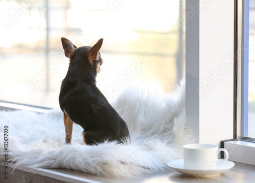 Cute funny dog sitting on window sill covered with plaid