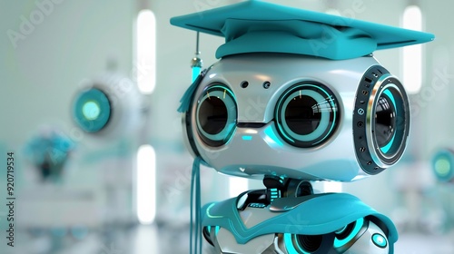 Cute futuristic little robot wearing a graduation cap