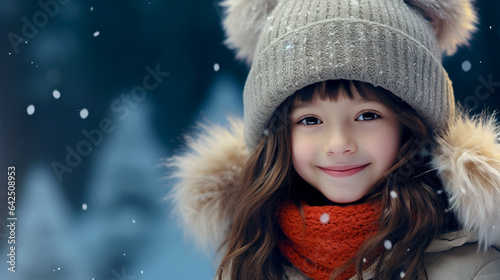Cute girl in a winter hat on a winter background with bokeh and copyspace