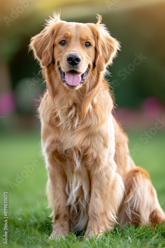 Cute Golden Retriever Puppy Sitting on Grass: Shallow Focus Vertical Shot