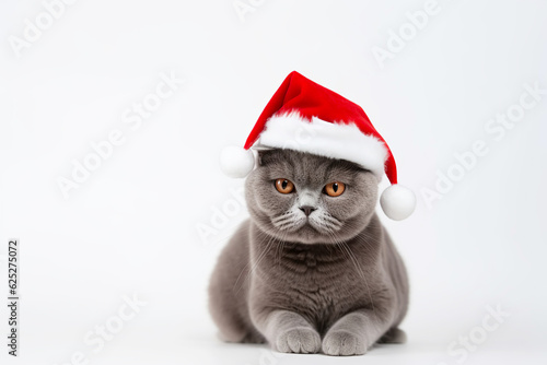 Cute Gray cat in santa hat on white background. Merry Christmas concept. Generative AI