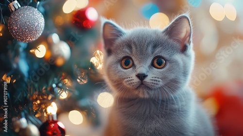 Cute Gray Kitten Surrounded by Christmas Tree Decorations and Lights
