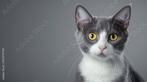 Cute grey and white cat with yellow eyes poses on a plain background, showing off its fluffy fur and whiskers. Perfect for pet lovers