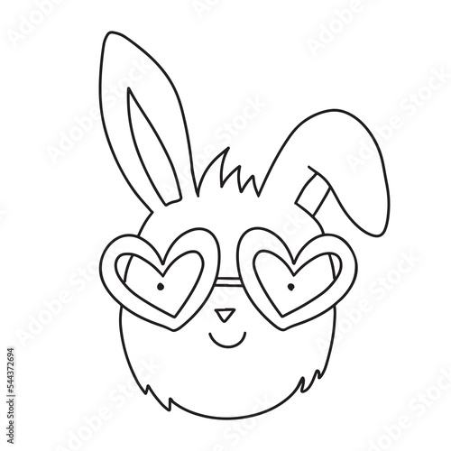 Cute groovy hare bunny rabbit in heart shaped sunglasses. Simple black and white contour drawing vector illustration isolated on white. Christmas character, symbol of New Year 2023