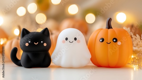 Cute Halloween figurines of a black cat, ghost, and pumpkin with smiling faces, AI