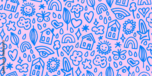 Cute Hand Drawn Doodle Pattern With Houses Rainbows Sun And Clouds whimsical