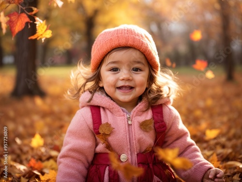 cute happy baby in autumn leaf background