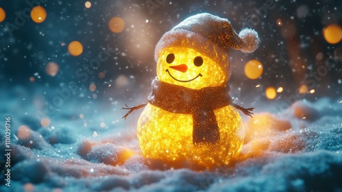 Cute illuminated snowman with snow animation . Snow and Christmas time