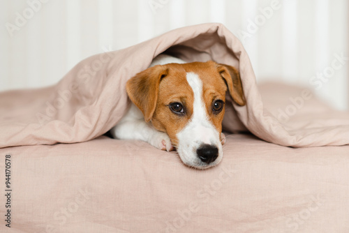 Cute Jack Russell Terrier dog lying on a bed, covered by a soft beige blanket. Funny puppy with brown and white fur, is peeking out from under the blanket, resting on the bed