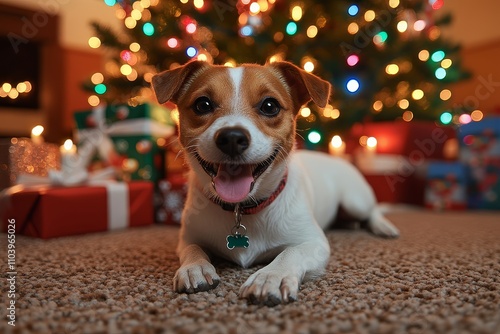 Cute Jack Russell Terrier dog lying on carpet in front of Christmas tree, surrounded by presents and colorful lights, with festive candles glowing.