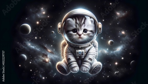 cute kitten astronaut floating in outer space, wearing an astronaut suit