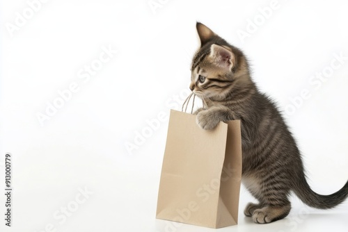 Cute kitten holding a smooth paper shopping bag in its mouth. Plain pure white background. Adorable and playful scene with soft, fluffy fur and gentle features.