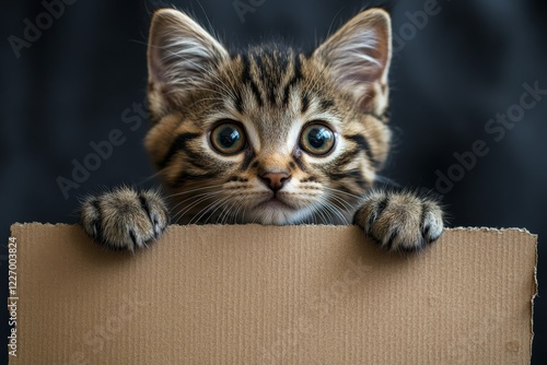 Cute kitten peeks over cardboard box with large expressive eyes in a playful moment indoors