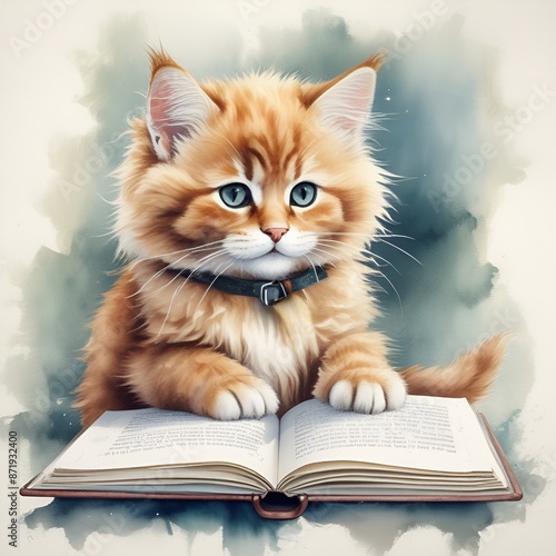 Cute kitten reading a book