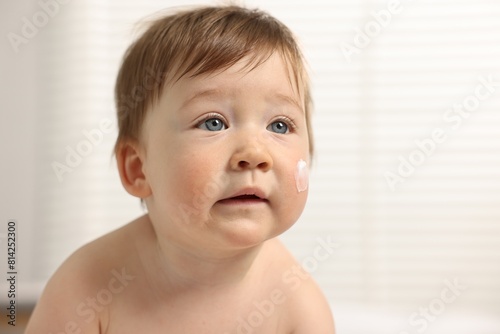 Cute little baby with moisturizing cream on face indoors