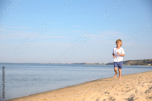 Cute little child running at sandy beach on sunny day