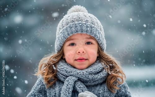 Cute little girl in a warm jacket and knitted hat on a snowy winter background
