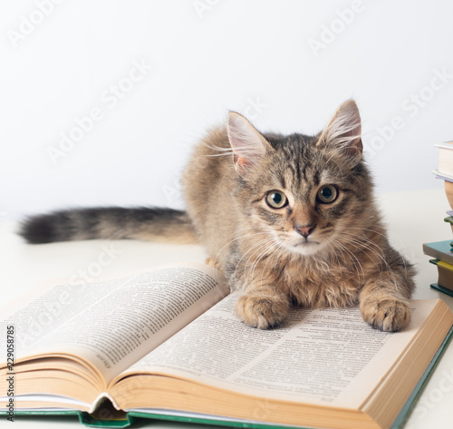 Cute little kitten with books on white background