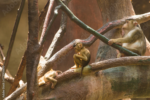 Cute little monkeys are sitting on the branches of a spreading tree and have a rest on a sunny warm summer day. Animal monkey life at the zoo concept.