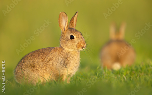 Cute little rabbit sitting in grass in spring