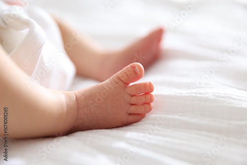 Cute newborn baby lying on bed indoors, closeup. Space for text