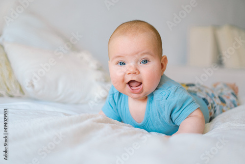 Cute newborn little baby boy in bed. Baby goods packaging template. Healthy child, concept of hospital and happy motherhood. Infant baby.