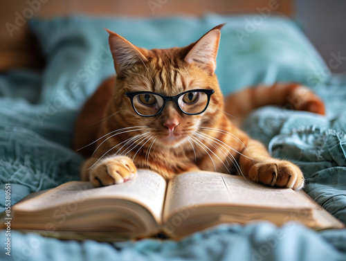 cute orange cat wearing glasses is lying on the bed reading an open book