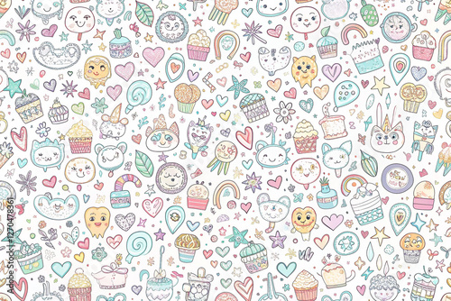 Cute pastel cartoon pattern with cupcakes, cats, and hearts; party background