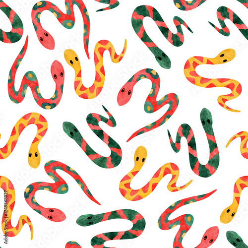 Cute pattern with colorful cartoon snakes. Watercolor seamless texture on white background. Symbol of Chinese New Year 2025. Template for wrapping paper.